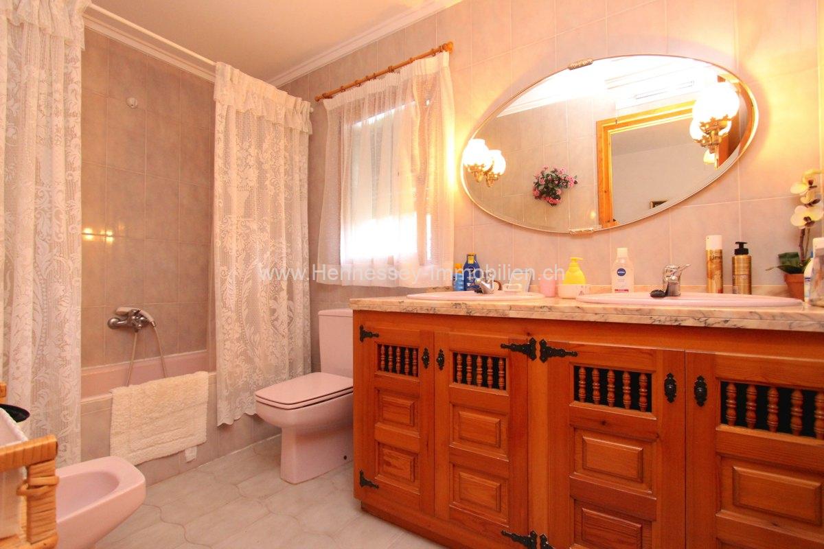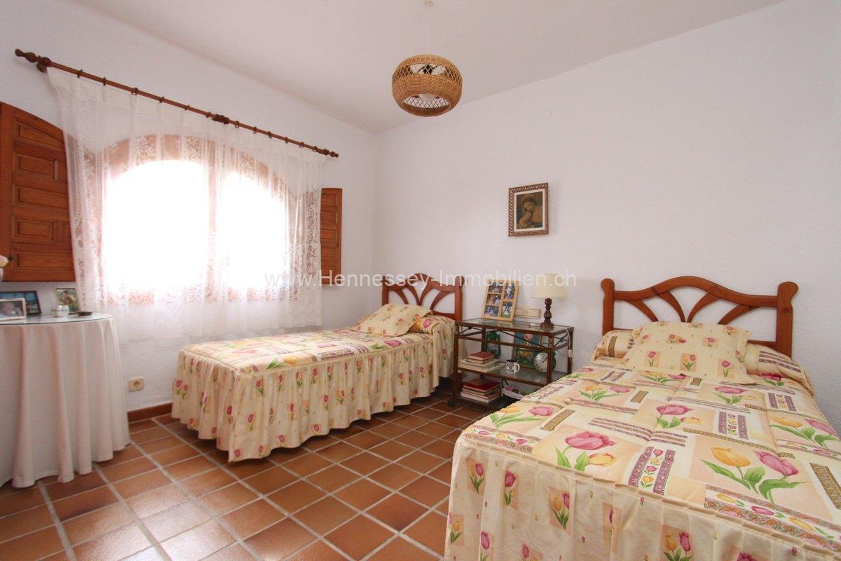 Im ersten Stock gibt es ein Arbeitzszimmer mit Wohnzimmer, Schlafzimmer und Badezimmer. Die Klimaanlage ist im ersten Stock installiert. Das Grundstück von 990 m2 besteht hautpsächlich aus gepflegter Wiese, Pflanzen und Bäumen welche für eine einfache Pflege gepflanzt sind.