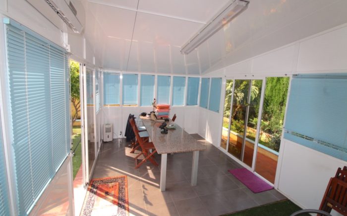 Im Erdgeschoss verfügt das Anwesen über eine verglaste Terrasse,