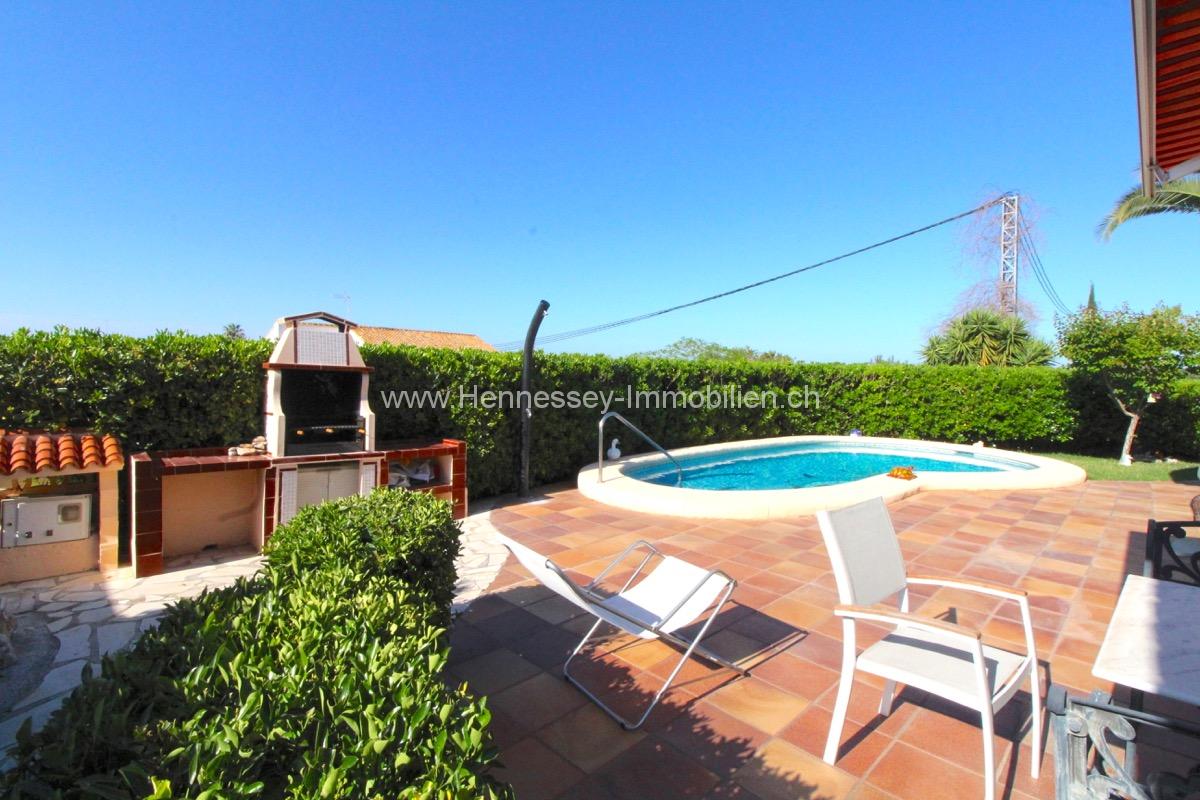 Auf dem flachen, sehr begrünten Grundstück, können die Sonnenstrahlen im privaten Pool genossen werden.