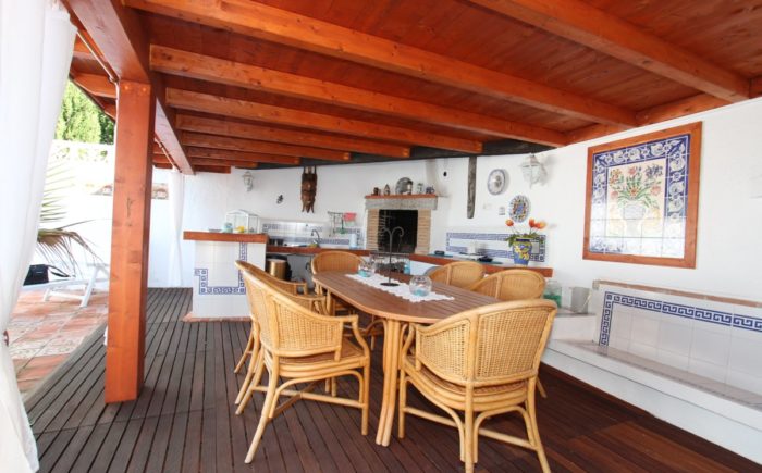 Der grosse Garten ist leicht zu pflegen. Neben der Sommerterrasse befindet sich eine vollgestattete Sommerküche mit dem 10 x 4 Meter grossen Pool.